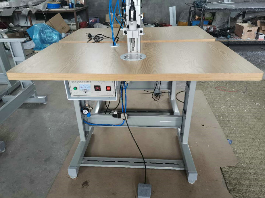 本機以超聲波將綁帶融合于口罩本體兩側,進而完成綁帶式口罩成品,只需一名操作員將口罩片置于超聲波發生器的頭上,后將綁帶放在口罩片上,腳踏踏板使氣缸向下運動,縫住綁帶和口罩片。
